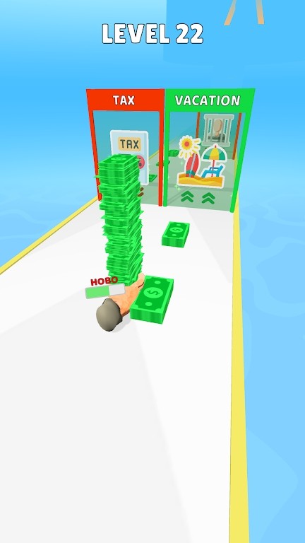 1、点击灰色TOUCH TO START按钮开始第一关,中间白色双向箭头可调整方向,钞票堆上有红色HOBO标签,背景是蓝天白云和白色道路。
